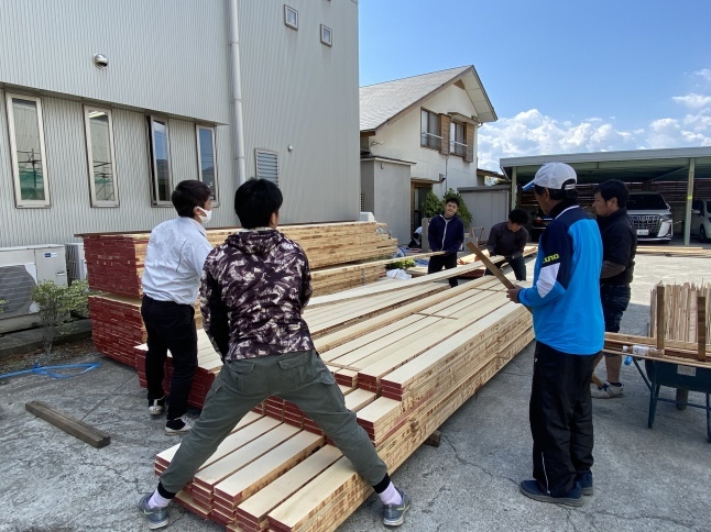 先日、本社工場で社長や営業、若い大工さん達とみんなでヒバ材積みを行いました。