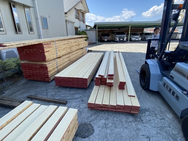 ヒバという木材は弊社では主に土台に使用しておりますが、今回積んでいるのは窓枠などに使用するものになっております。