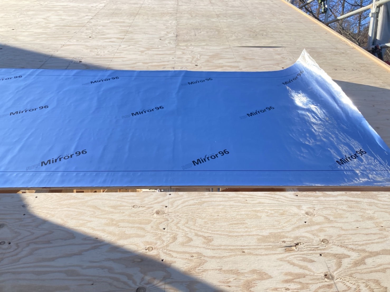 屋根の骨組みを組むと構造用ラーチ合板を乗せて、宇宙服の技術にも応用されているレフミラー96(遮熱シート)を敷きます!