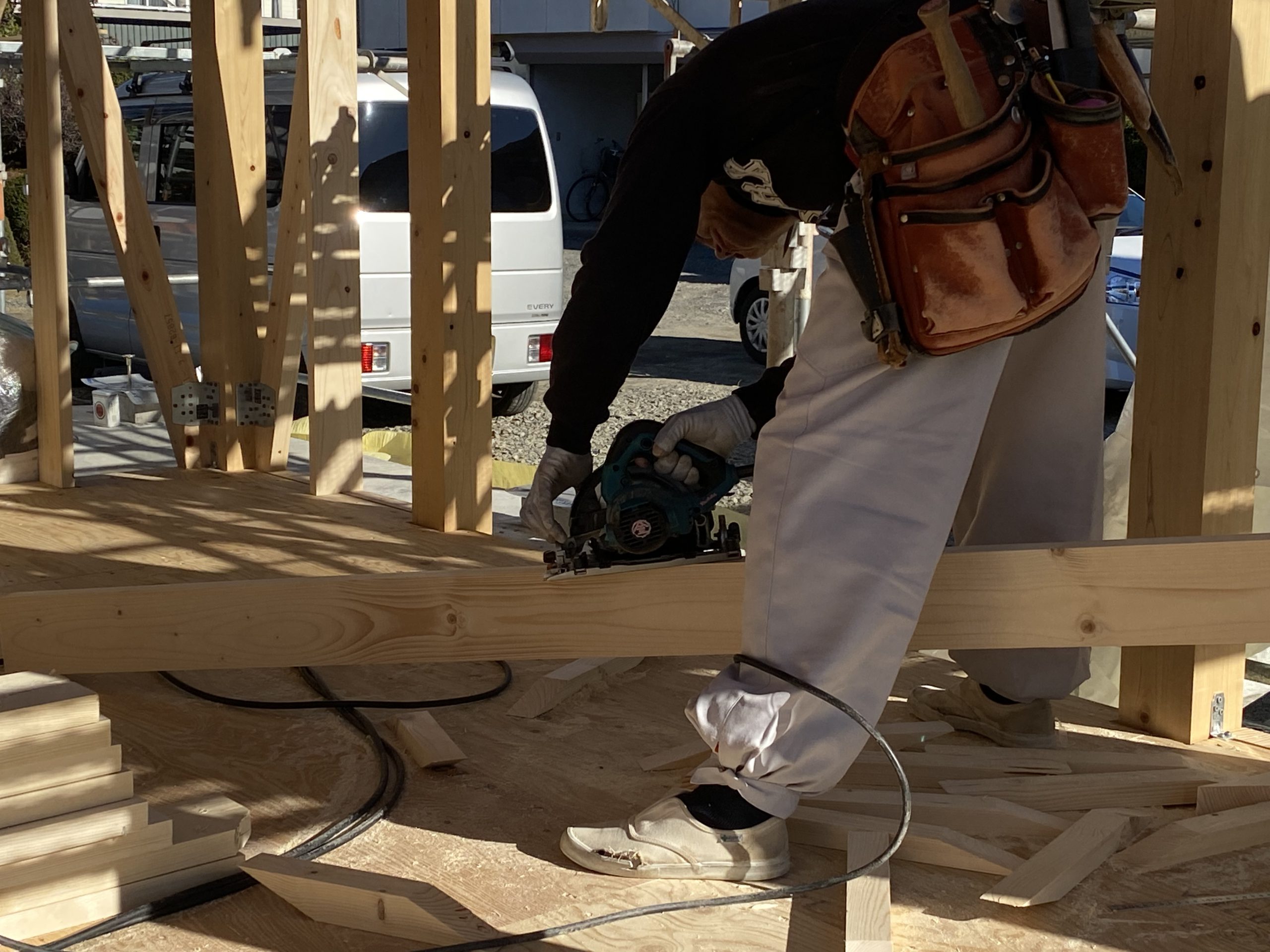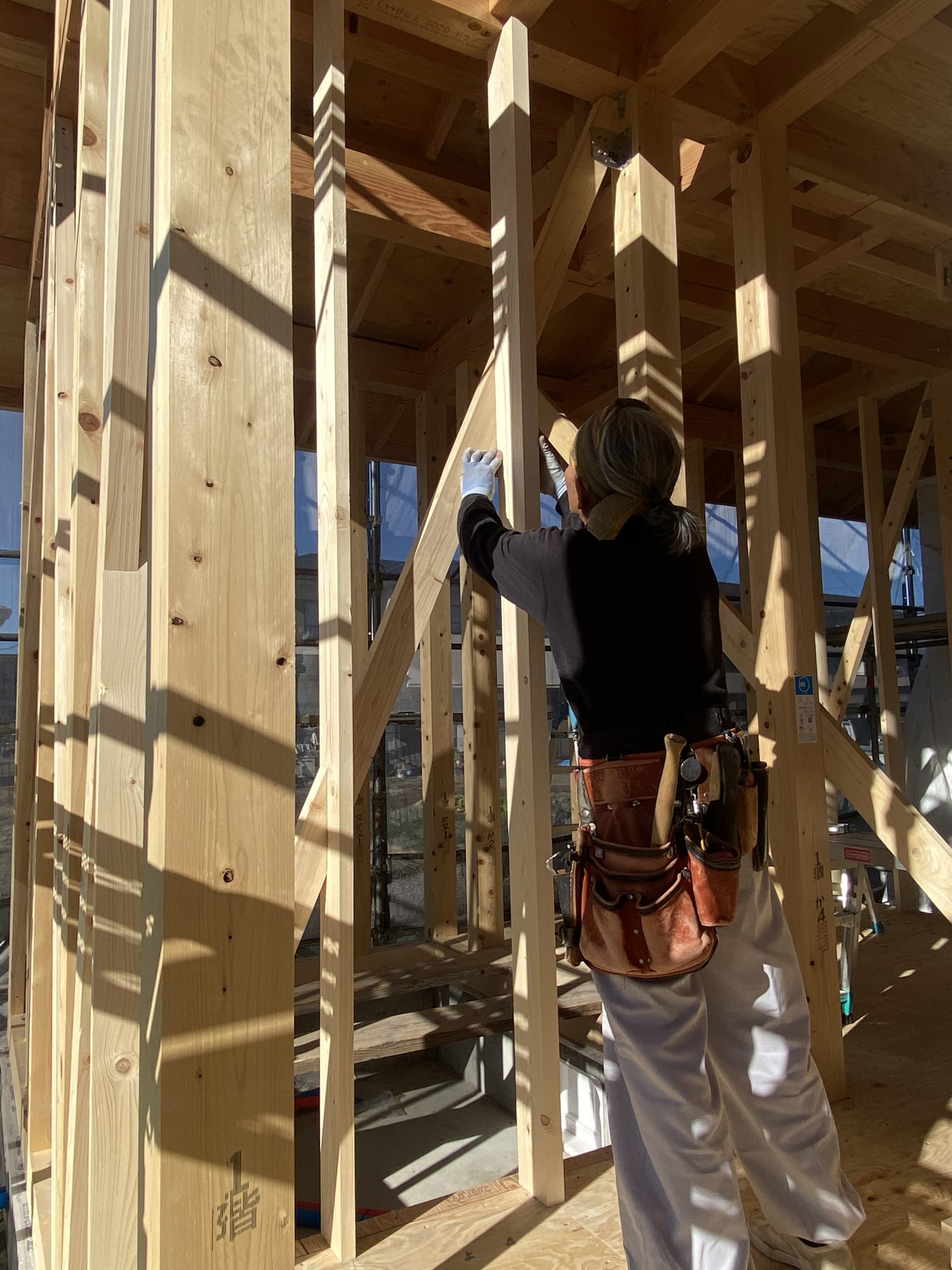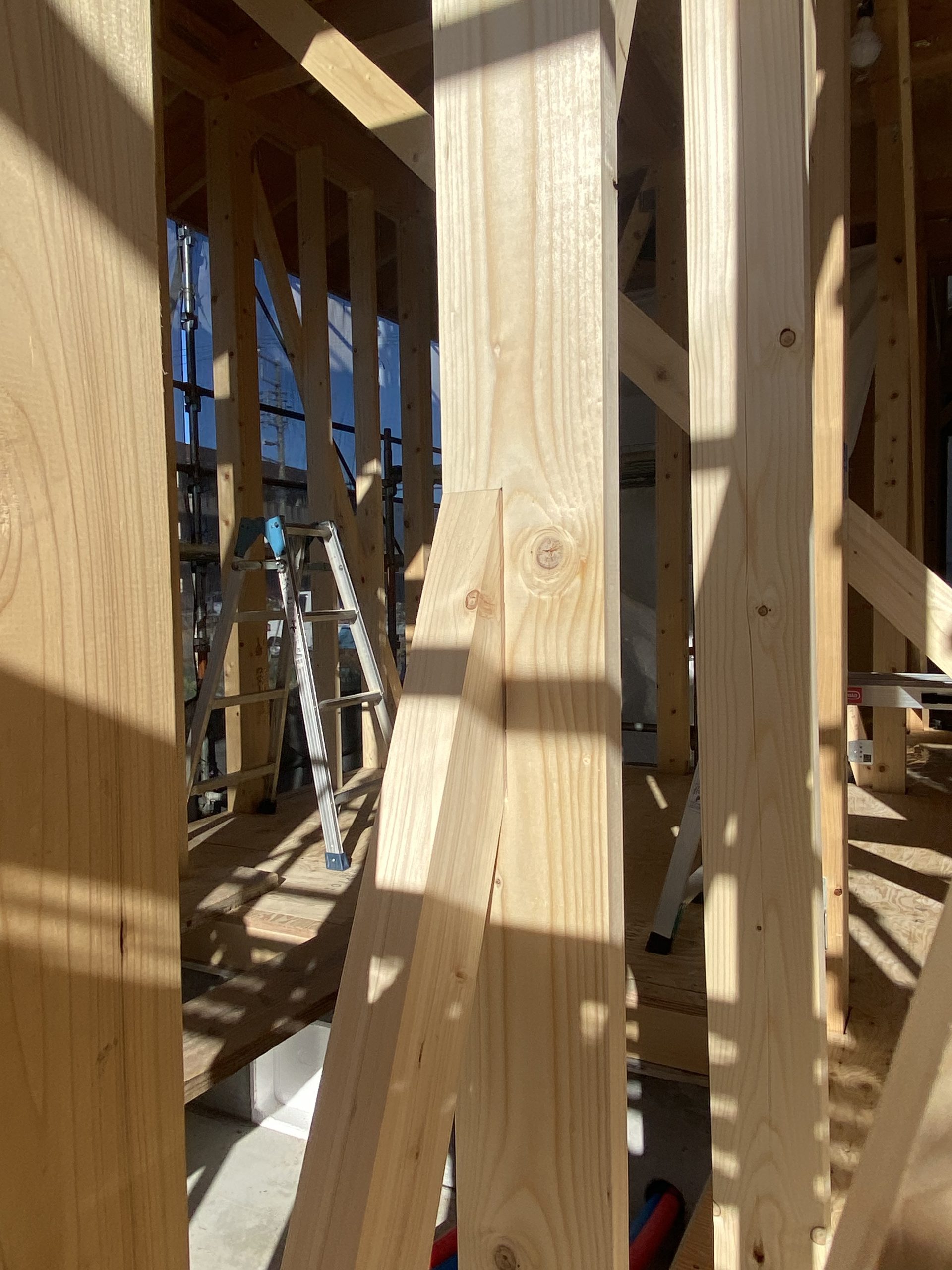 今日現場では大工さんが間柱を刻んで取り付けておりました❗️筋交いが斜めに入っているのでそれに合わせて組んでおります✨