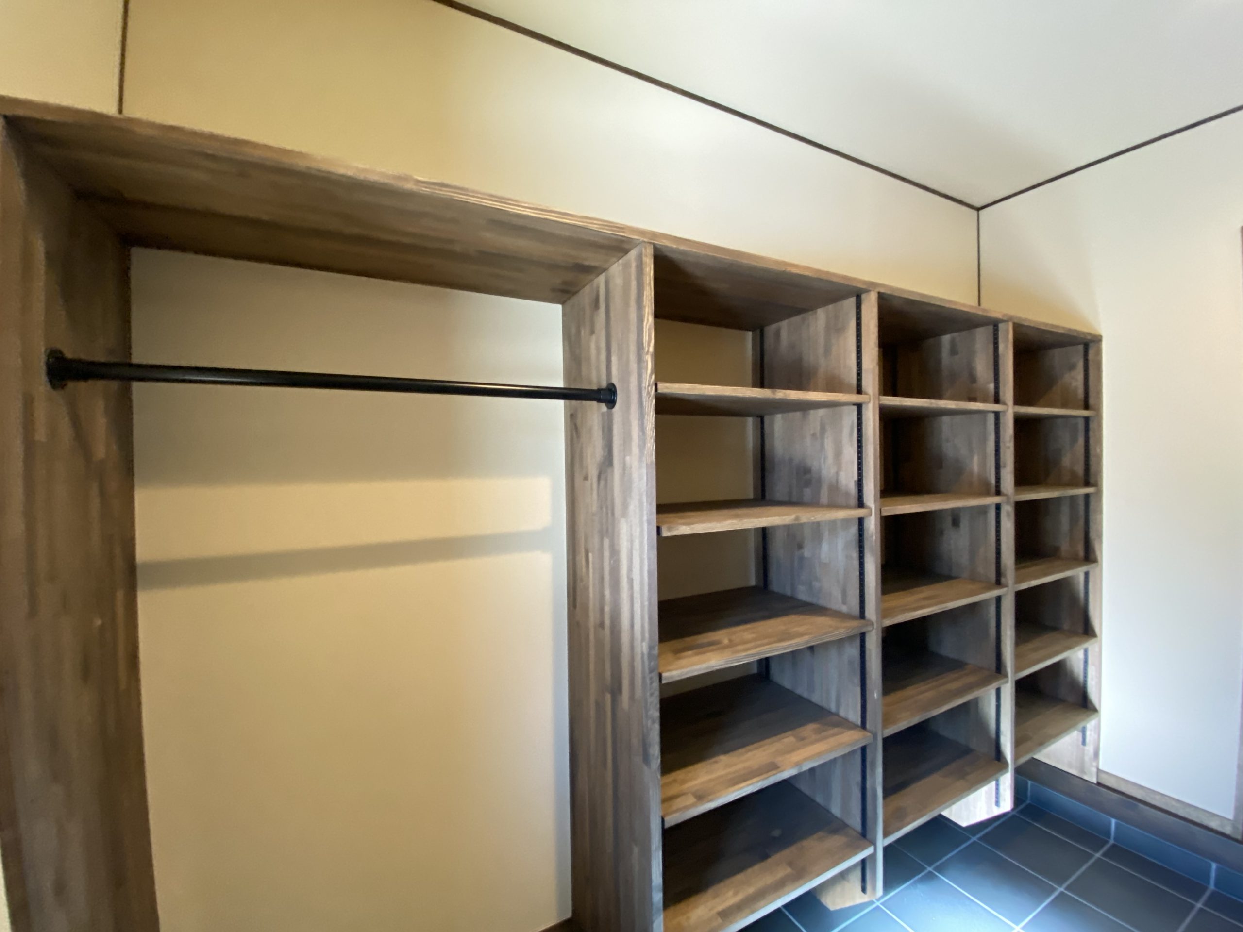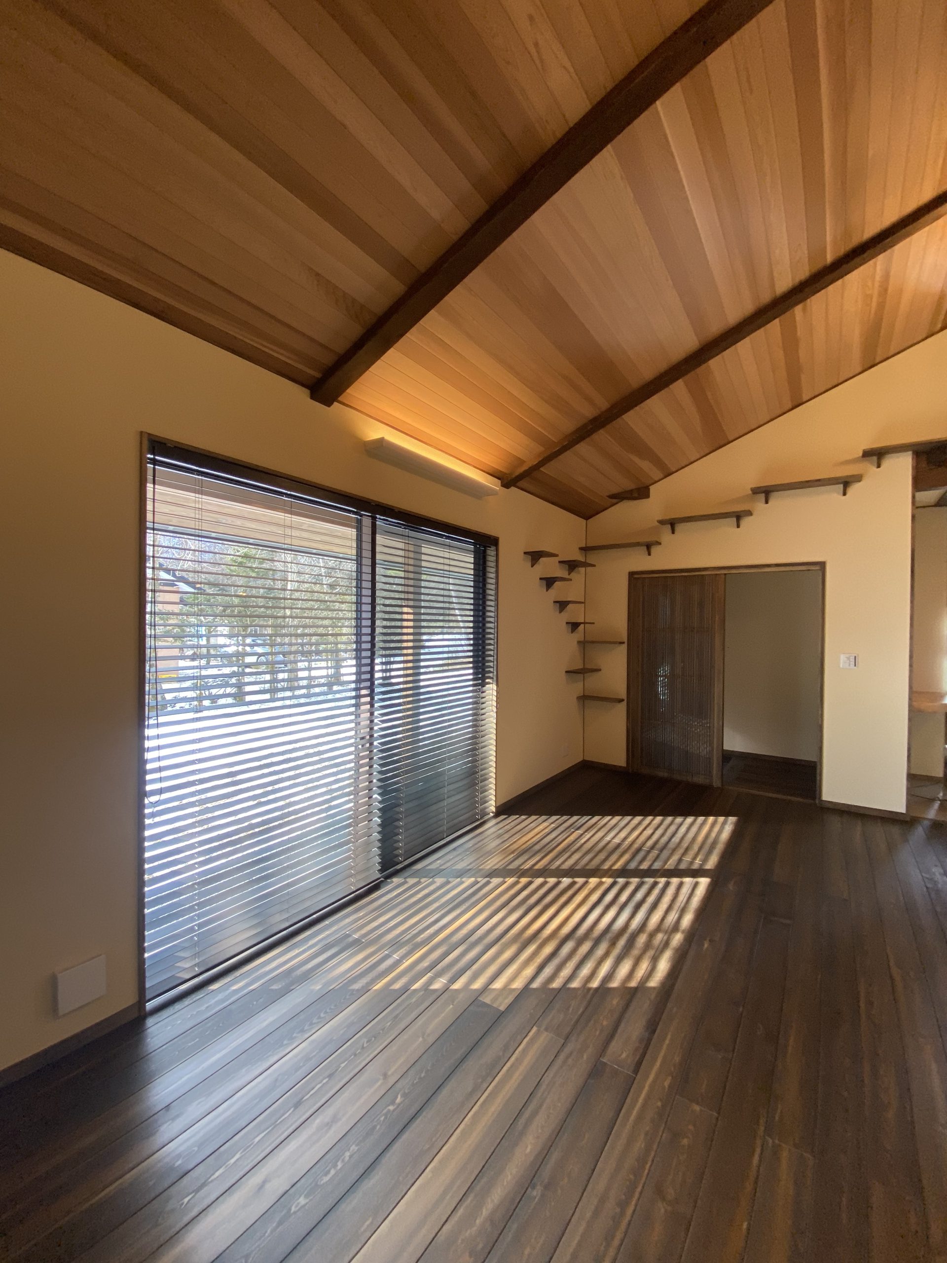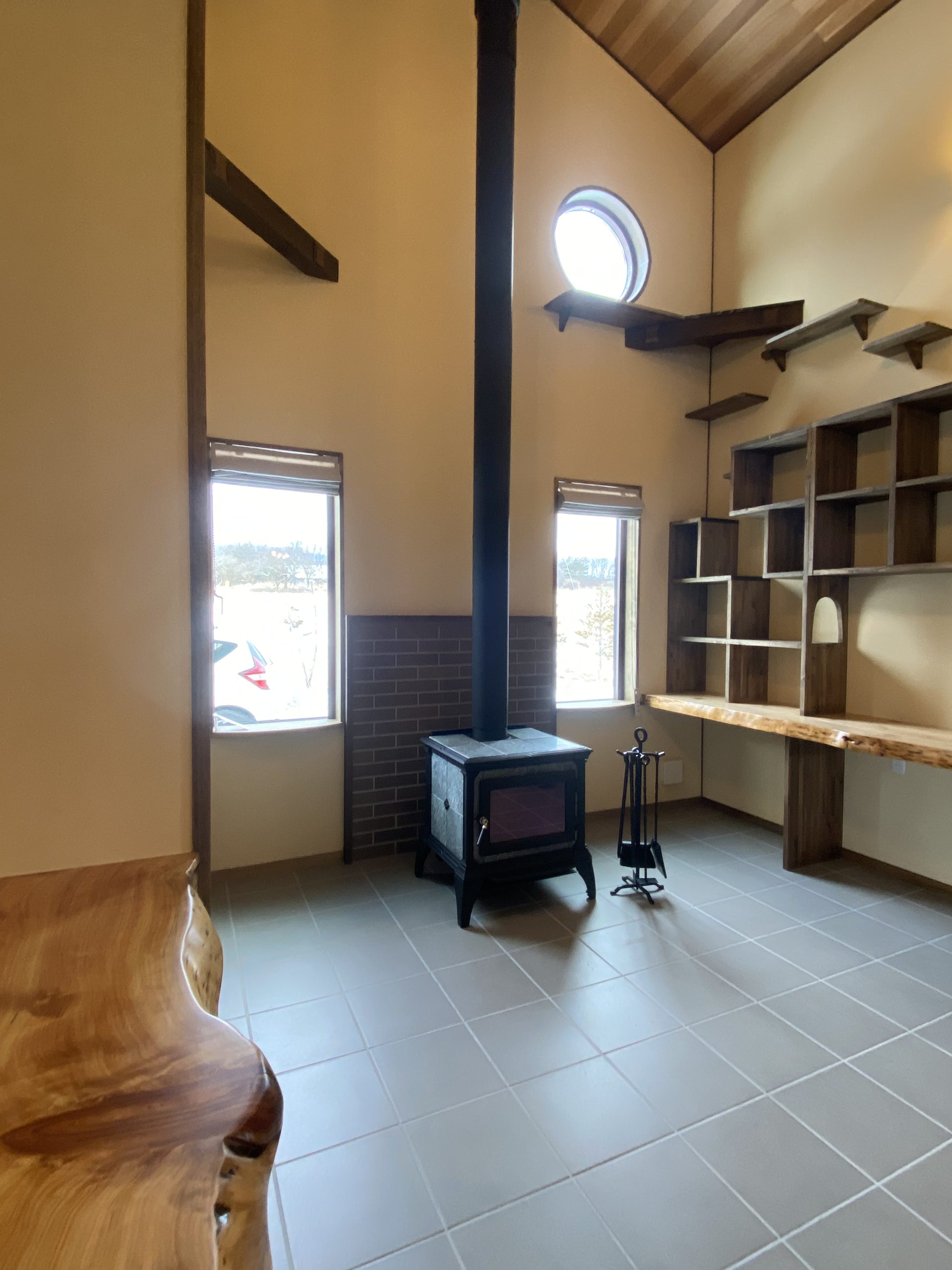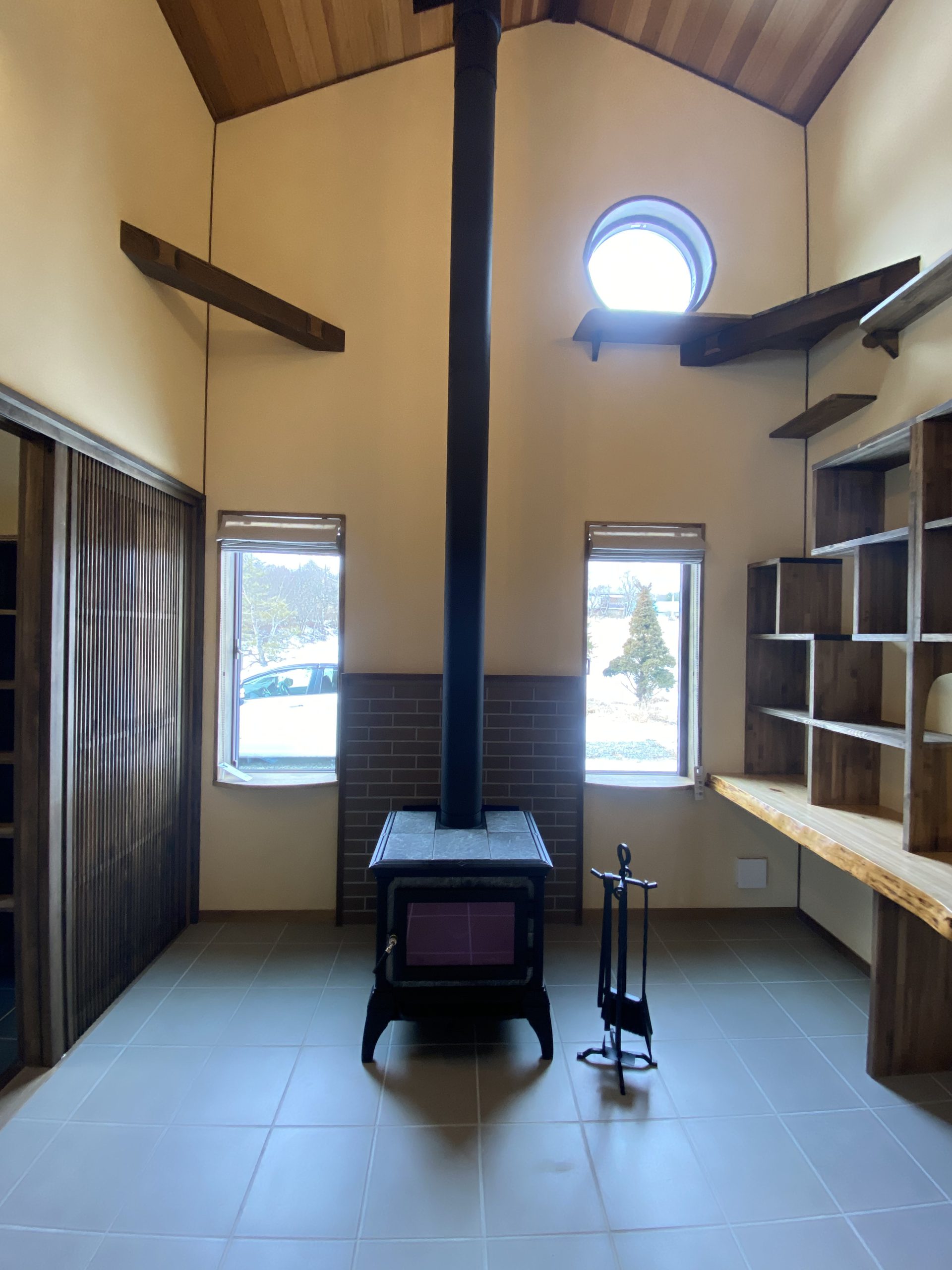 寒い地域ですので、薪ストーブがありその隣には造作棚・キャットウォークがあります✨