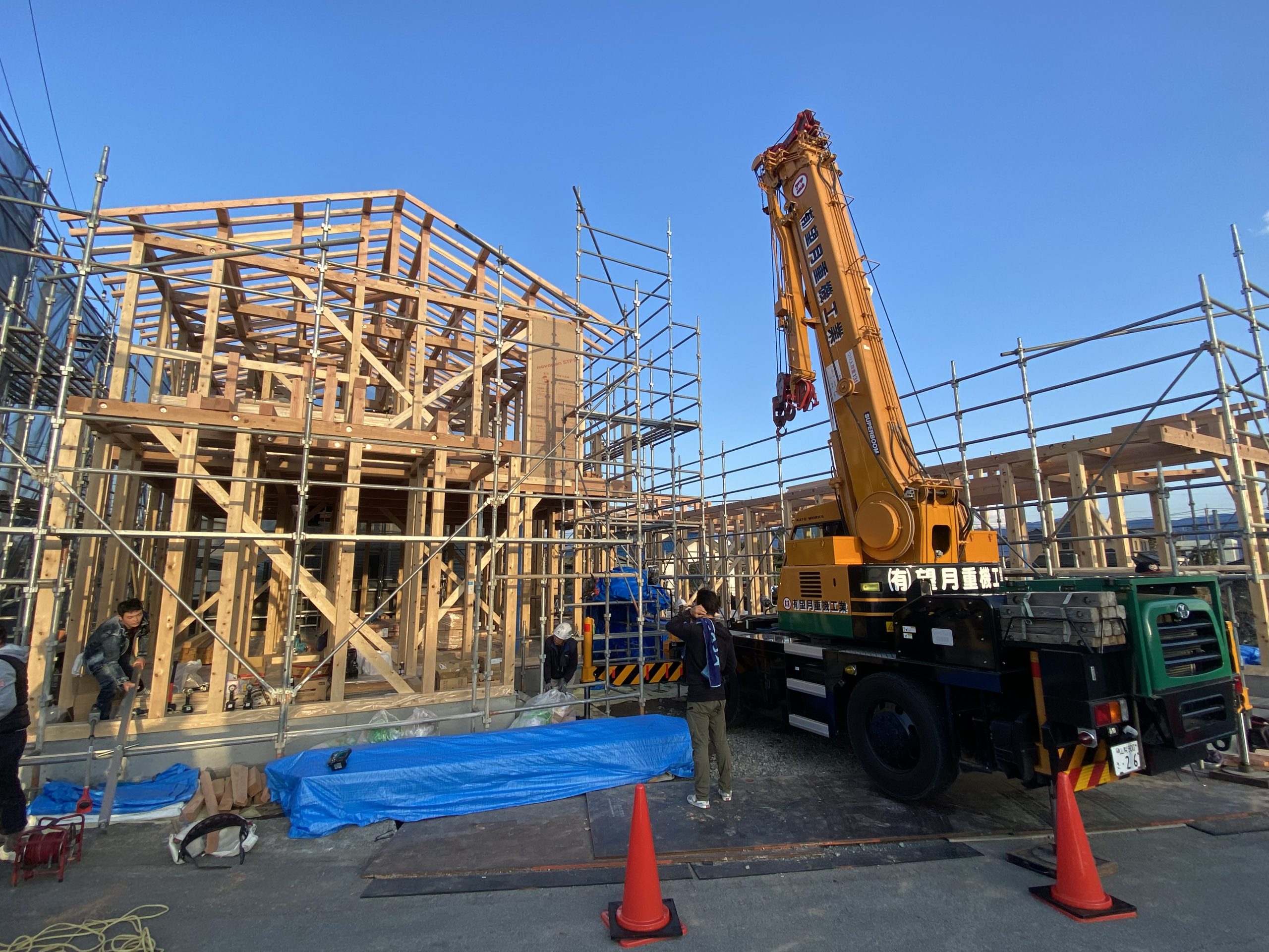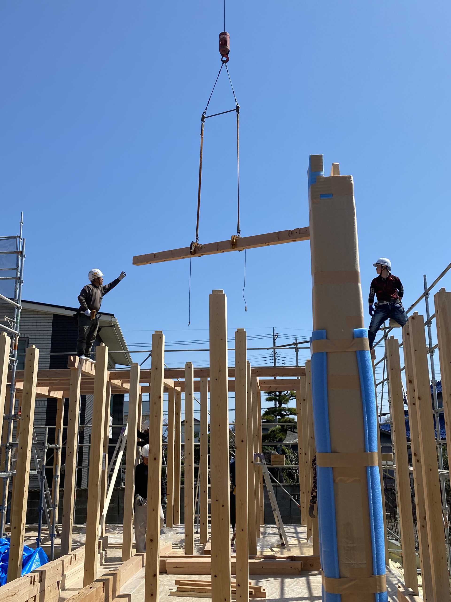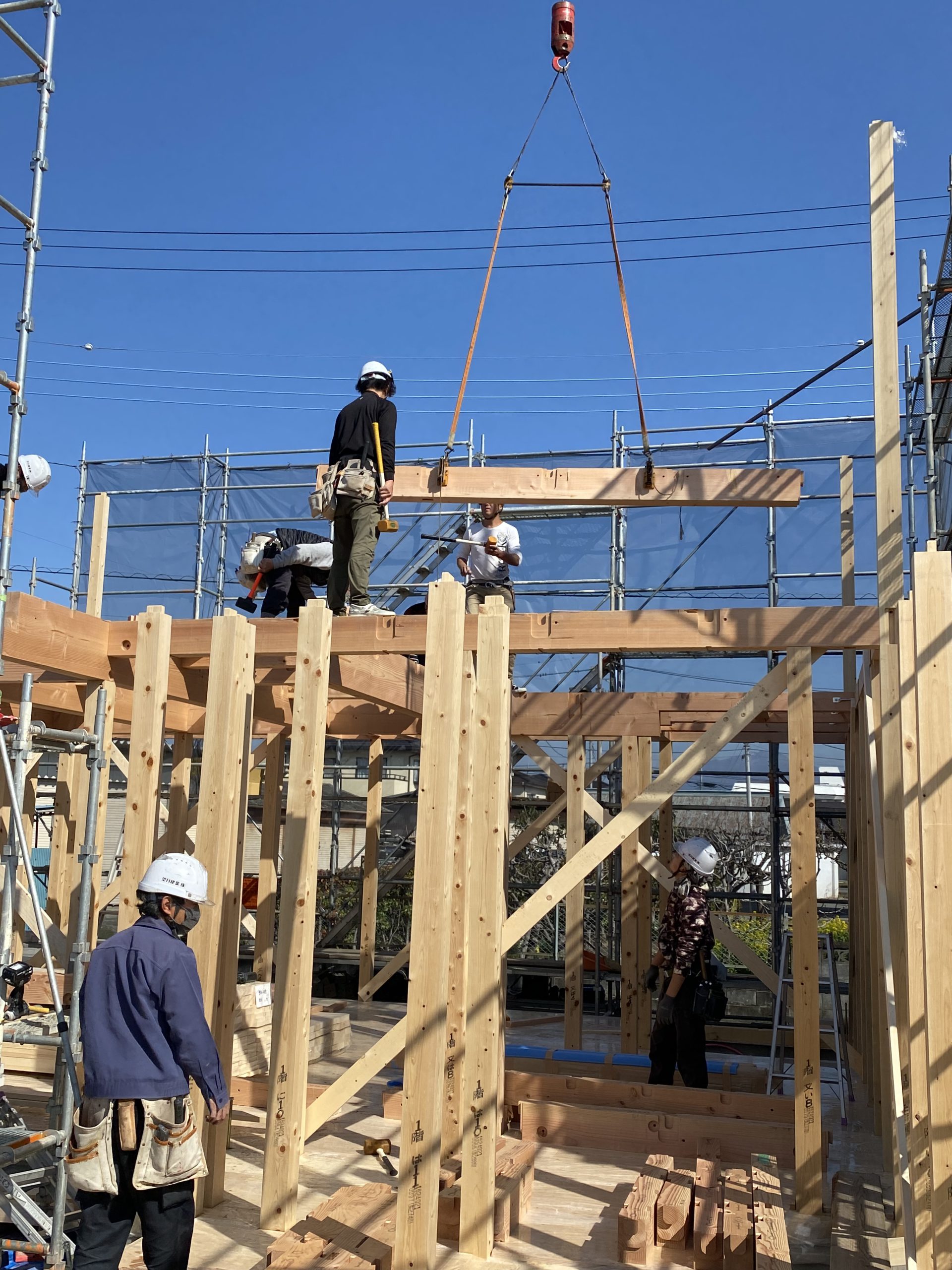 建て方で柱を建てて、梁を掛け、屋根までの骨組みを組んでいきます!
