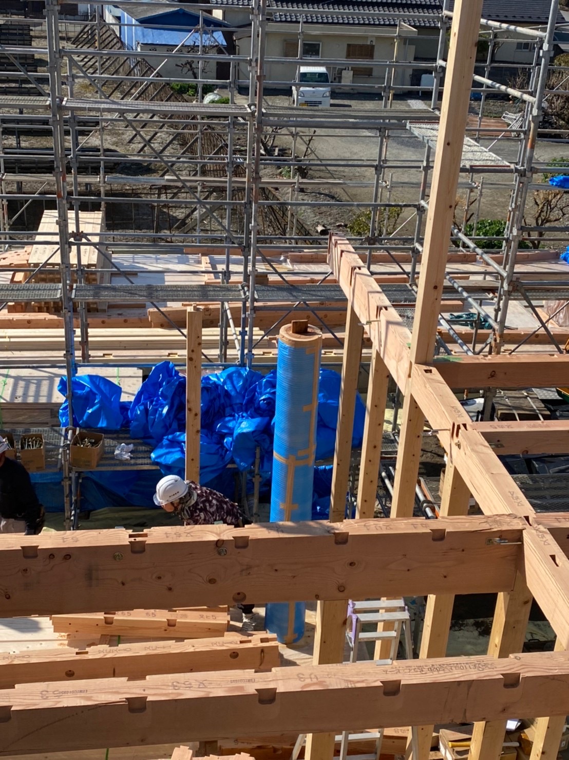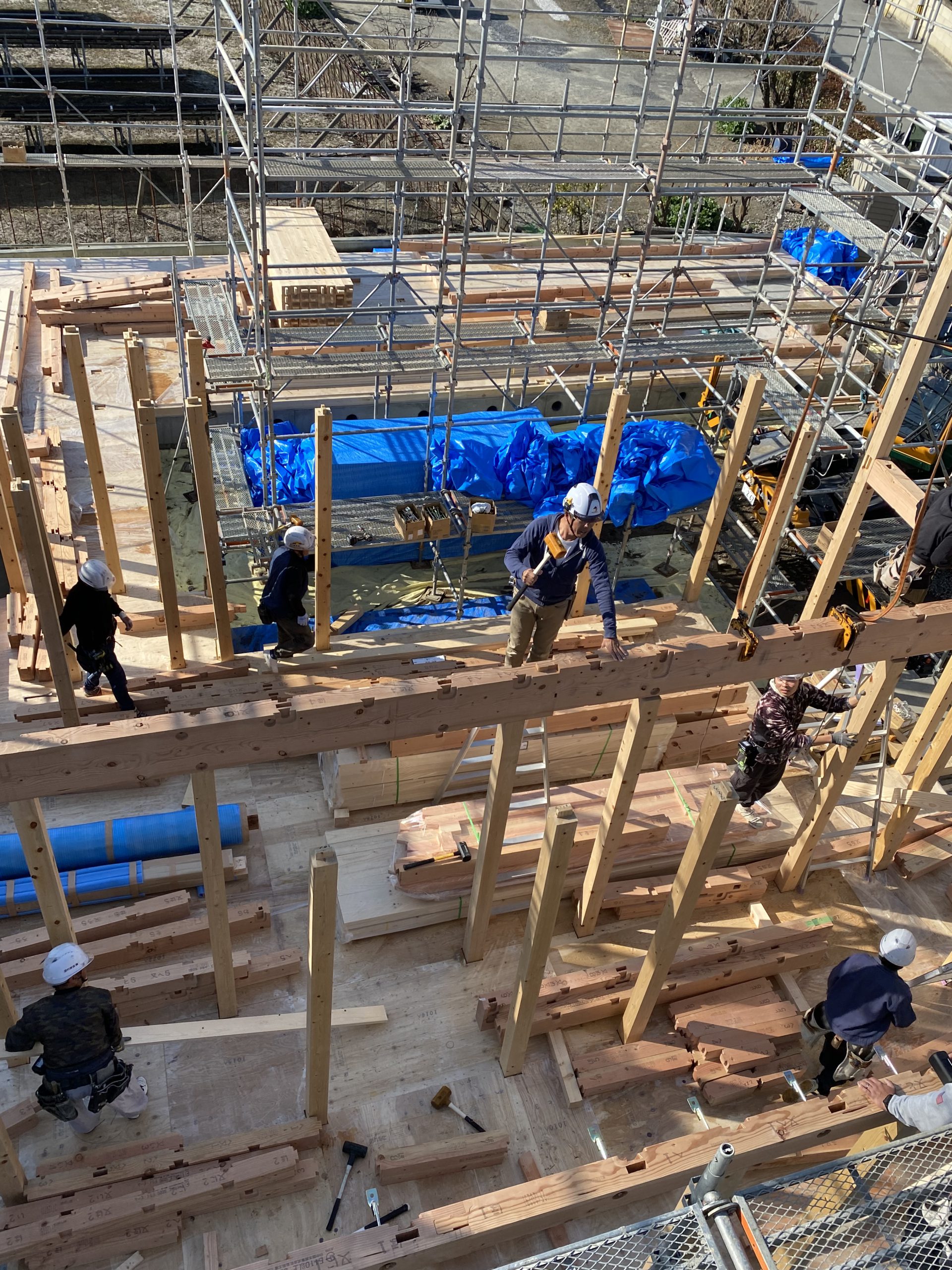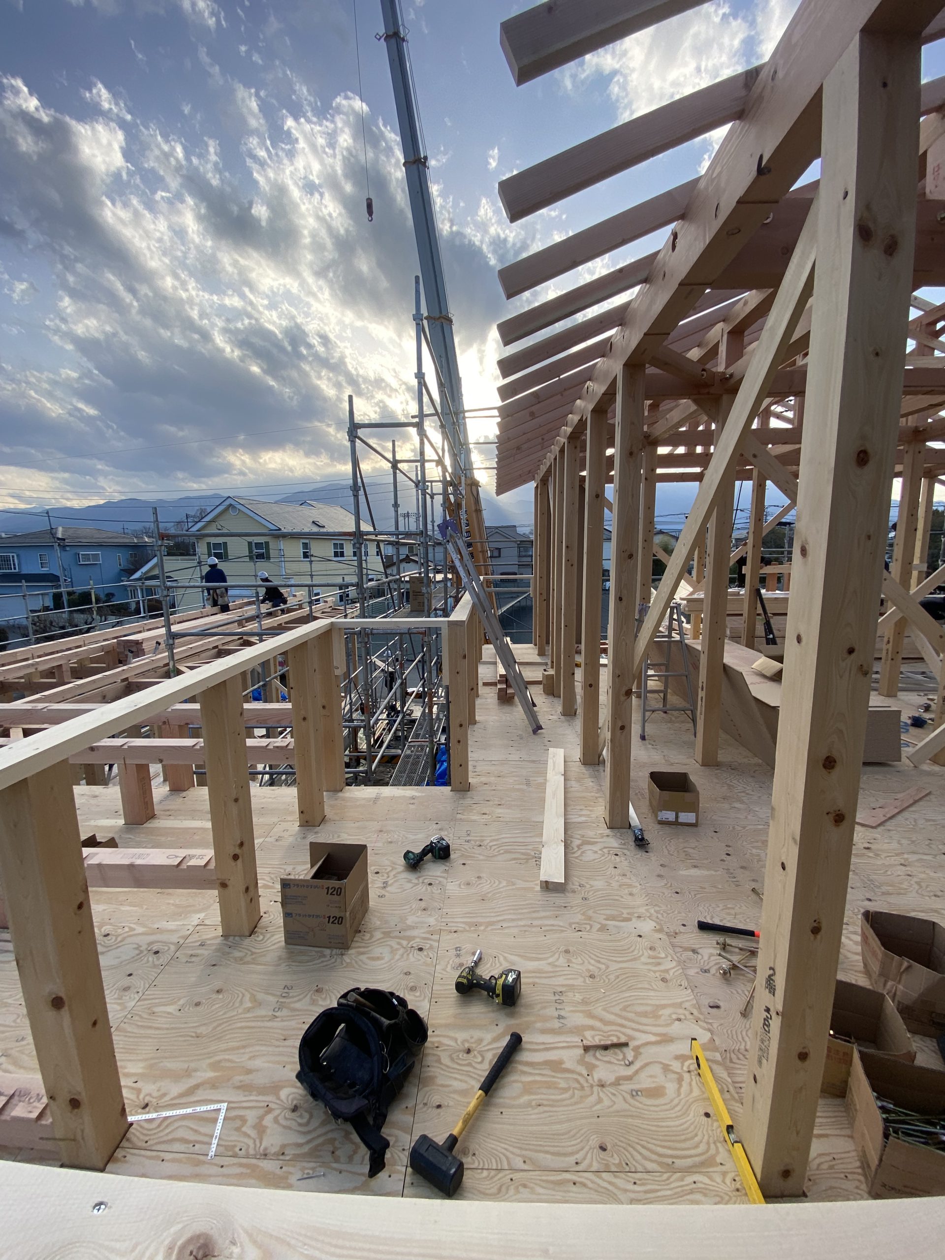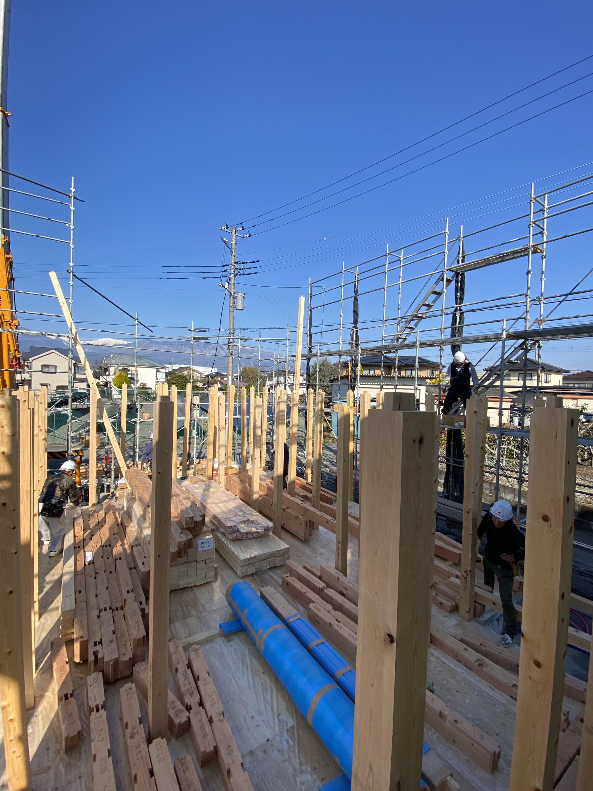 建て方で柱を建てて、梁を掛け、屋根までの骨組みを組んでいきます!