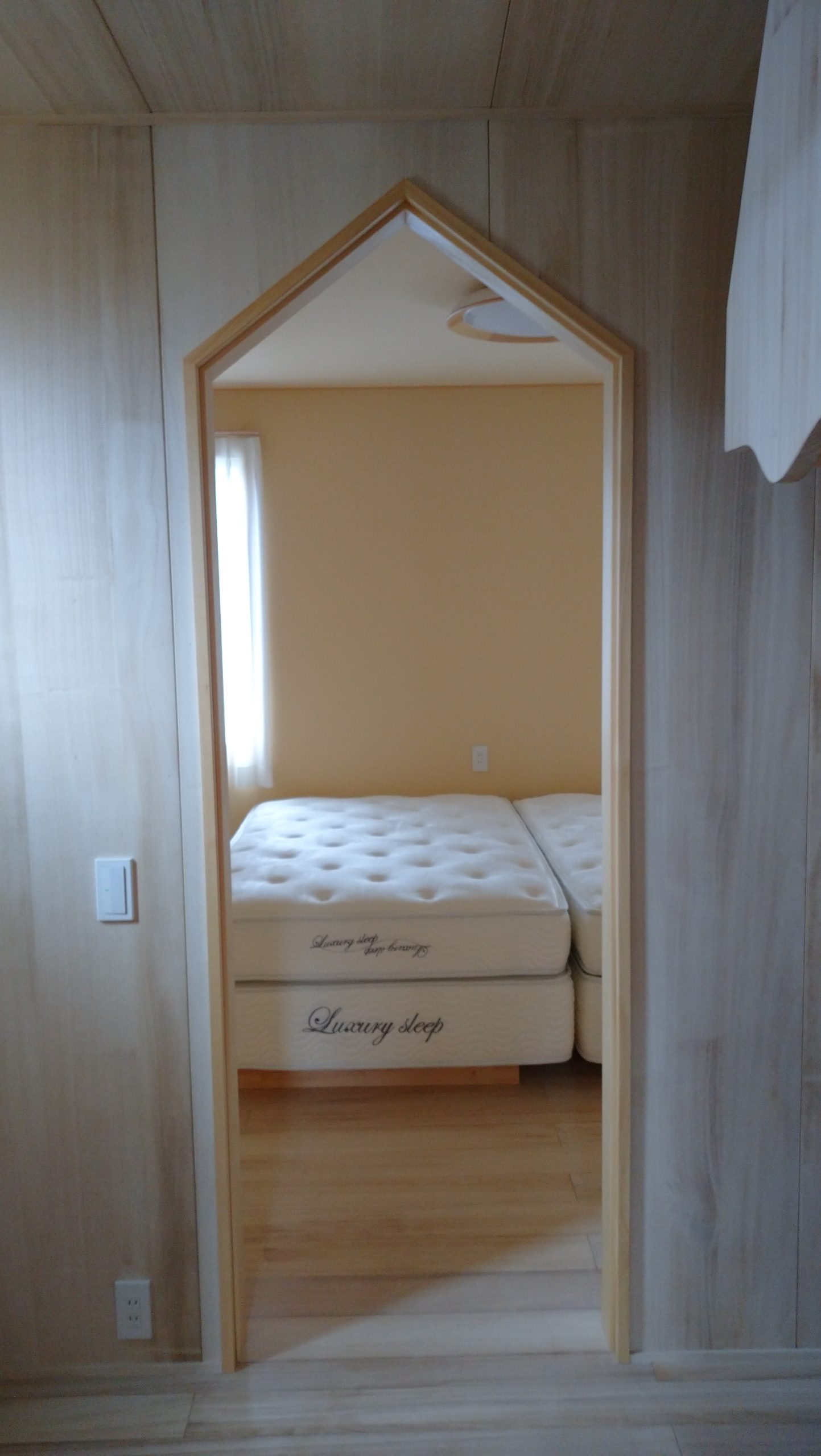 大工さんがお客様の要望に応え、寝室へとつづく開口も三角に統一され職人の腕が光ります✨