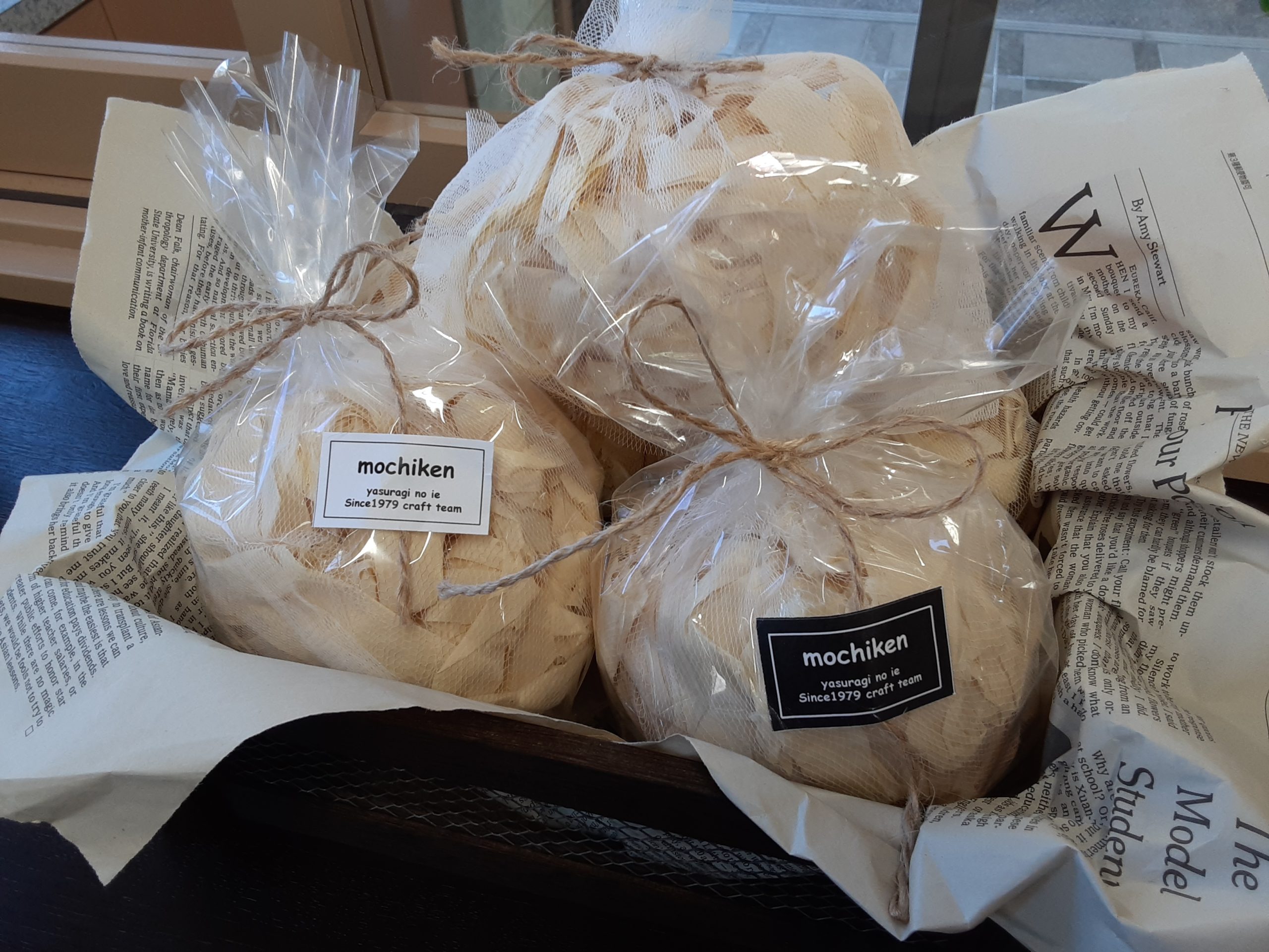 事務所でせっせと袋詰めをしていたヒバ材のカンナくず。