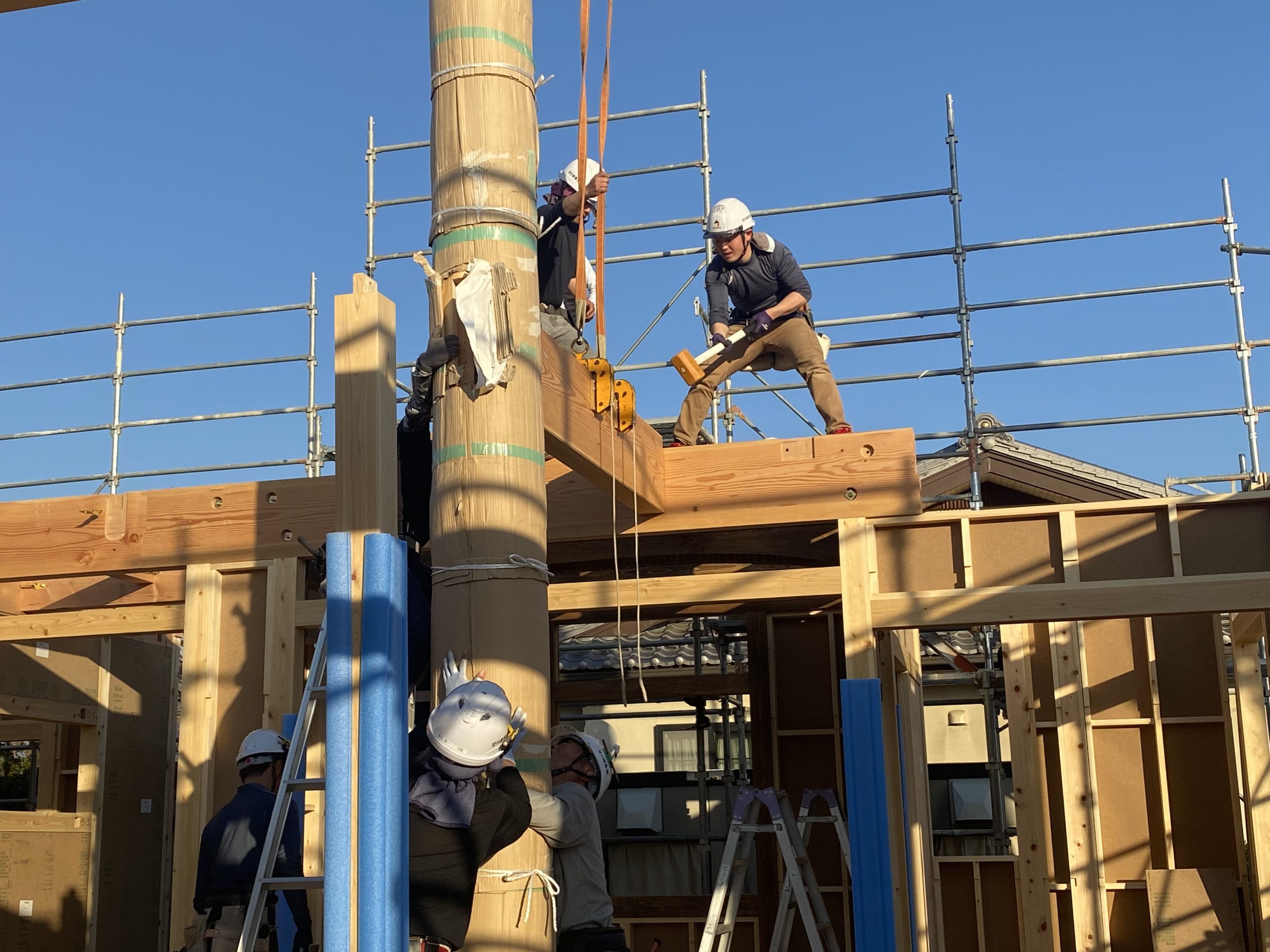 大切な住まいの要、太い梁組みを支える大黒柱は林業の山師さんに特別に依頼し、機械伐採でなく傷がつかないように丁寧に手作業での伐採をしてもらいます。