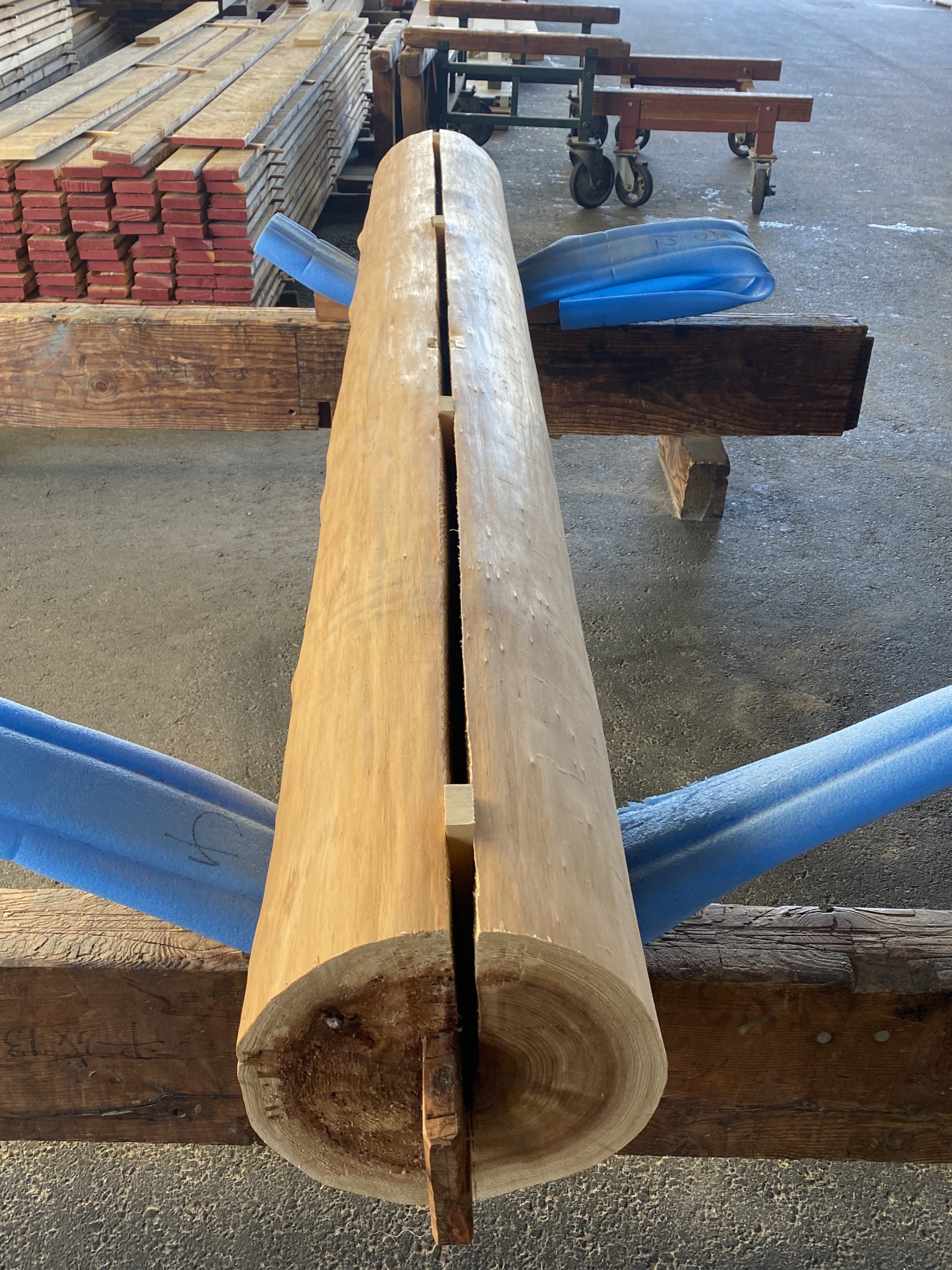 これから原木を皮剥き、背割れ、養生をし、工場の中でじっくりと自然乾燥させます。