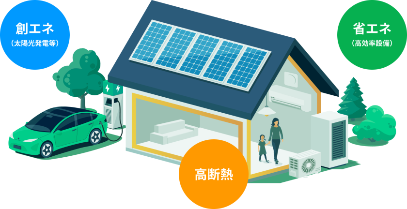 「ZEH」とは、Net Zero Energy House(ネット・ゼロ・エネルギー・ハウス)の略語です。建物の断熱性能を高めて、高効率な設備を導入することによって消費するエネルギーを少なくすることで「省エネ」を実現するとともに、太陽光発電などの再生可能エネルギーを創り出す「創エネ」によって、エネルギー収支が正味ゼロになることを目指した住宅のことをいいます。